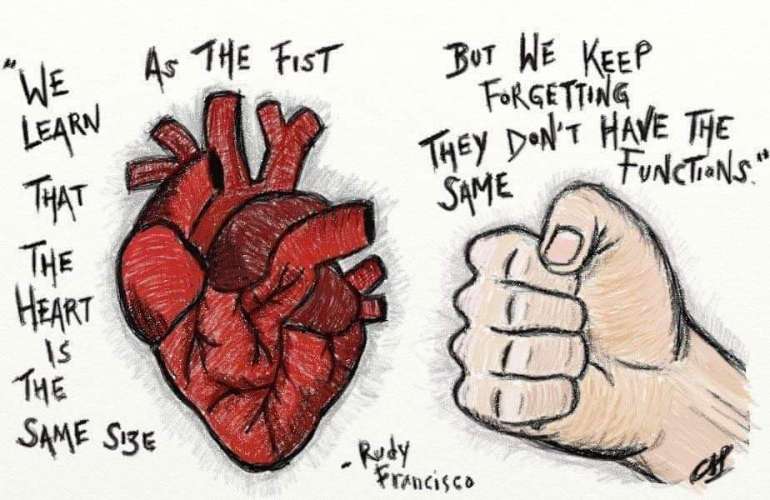 And the article says, ‘The Mexican government confiscates approximately 30,000 illegal firearms per year.’ When the guns are taken they get dismantled and the metal is used to make other types of weapons that will later be utilized by their military. In 2012, Pedro Reyes, an artist from Mexico City, convinced his government to donate the guns to him and he turned them into musical instruments. So somewhere there’s a tambourine, a drum set, a guitar, All made by things that were used to take people’s lives, But now they create sound that puts life back into people’s bodies, Which is you say a weapon will always be a weapon, But we choose how we fight the war, And from this I learned that even the most destructive instruments can still create a melody worth dancing to, And sometimes don’t we also call that a battle? I wonder how long it took to convince the first rifle that it can hold a note instead of a bullet but still fire into a crowd and make everyone move. When I was 6 I was taught how to throw a punch, And in the 80s that was the Anti Bullying Movement. The first time one of my classmates took a ‘Yo Mama’ joke a little too far I remembered my training, So I turned his nose into a fountain. My fist 5 pennies, I closed my eyes, Made a wish, I came home with bloody knuckles and it was the first piece of artwork my family hung on the fridge. I remember staring at my hands the same way you stare at a midterm when all your answers are correct. I didn’t know what class this was, But I did know I was passing, And isn’t that what masculinity has become? A bunch of dudes afraid of their own feelings, Terrified of any emotion but anger, Yelling at the shadow on the wall, But still haven’t realized that we’re the ones standing in front of the light. We learn how to dodge and jab. We learn how to step in before we swing. We learn that the heart is the same size as the fist, But we keep forgetting they don’t have the same functions. We keep telling each other to man the fuck up When we don’t know what the fuck that even means. We turn our boys into bayonets, We point them in the wrong direction, We pull their triggers, And then we just ignore all the damage they’re doing in the distance. The word repurpose, It means to take an object and give it amnesia. It means to make something forget what it’s been trained to do so you can use it for a better reason. I am learning that this body is not a shotgun. I am learning that this body is not a pistol. I am learning that a man is not defined by what he can destroy. I am learning that a person who only knows how to fight can only communicate in violence, And that shouldn’t be anyone’s first language. I’m learning that the only difference between a garden and a graveyard is what you choose to put in the ground. You see, once, I came across a picture of a strange-looking violin. The caption said that it was made out of a rifle. I thought to myself, ‘Someday that could be me’.”
